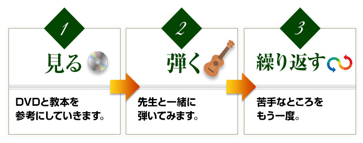 音楽教室のお試しレッスンに行って良く分かりました、その場では出来ても、繰り返しやらないとゼッタイに覚えられません、なので、ウクレレ教室に何度も通うより、苦手な個所を繰り返しすることによって短期間で上達できました。