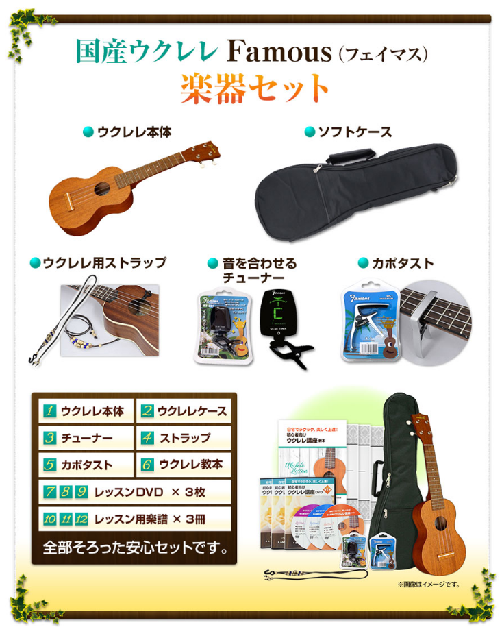 特にありがたいのは、「ストラップ」「ケース」や音を合わせる「チューナ」や演奏の幅を広げる「カポタスト」が全部そろっている、初心者セットなんです。